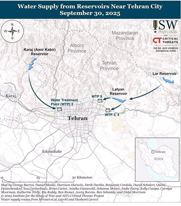 اخیرا وبگاه «موسسه مطالعات جنگ»(ISW) نقشهای از وضعیت ذخایر آب تهران(۳۰ سپتامبر/ ۸ مهر) منتشر کرده است. طبق اسامی که زیر این نقشه قید شده، حدود بیست نفر که عمدهی آنها یهودی هستند(بر اساس نام و نام خانوادگی واضح یهودی) در تهیه این نقشه همکاری داشتند.