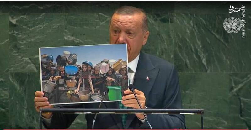 به گزارش روایت فردا رجیب طیب اردوغان رئیسجمهور ترکیه در هشتادمین مجمع عمومی سازمان ملل متحد: به این عکس نگاه کنید. اینها زنانی هستند که ظرفهای غذای خود را برای زنده ماندن این چنین نگه داشتهاند. آیا این انسانیت است. دکترها بازداشت میشوند و آمبولانسها هدف قرار میگیرند.