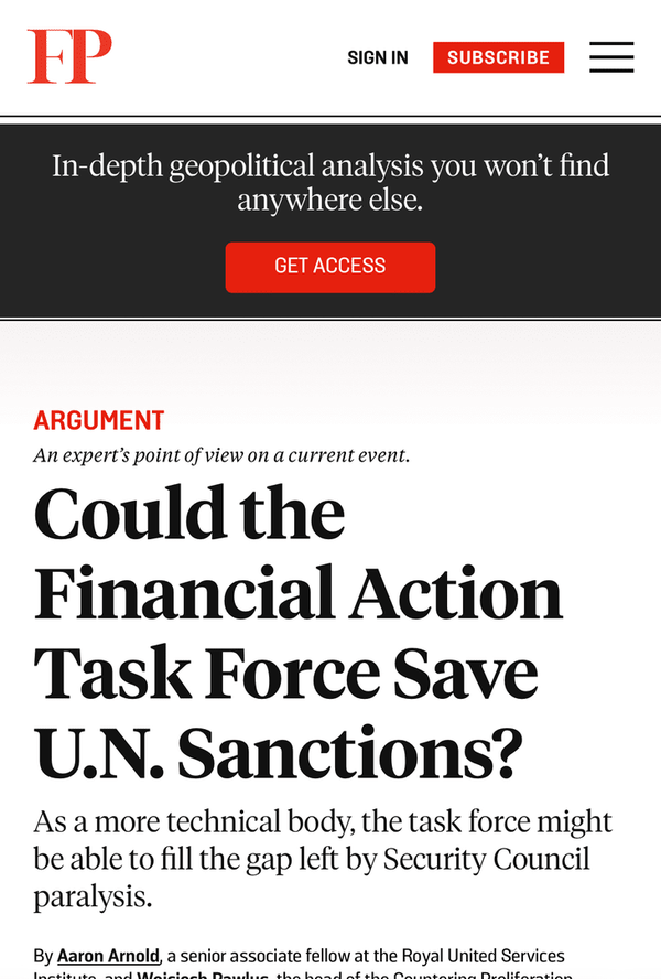 به گزارش روایت فردا نشریه فارین پالسی با تایید بی‌اثر و ناتوان بودن تحریم‌های شورای امنیت سازمان ملل نوشت، راه حل، ایجاد یک سازوکار موازی با سازمان ملل است که بتواند رژیم‌های تحریمی را تقویت کند و FATF ممکن است نهادی باشد که بتواند این چالش را بر عهده گیرد.