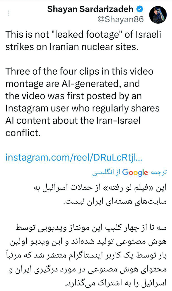 «شایان سرداریزاده» خبرنگار بیبیسی در همان ساعات اولیه انتشار این ویدیوها در شبکه اجتماعی ایکس ساختگی بودن آنها را تایید کرد.خبرنگار بیبیسی نوشت: «خطاهای قابل توجه شامل نشانها و یونیفورمهای نظامی اشتباه، دستها و اشیا عجیب روی میزها و کمدها، ادامه کار عادی کارکنان حتی پس از وقوع انفجارها و سالم ماندن دوربینهای بهاصطلاح مدار بسته است.»به گزارش فرانس۲۴، حساب کاربری که به عنوان منبع این ویدیوها ذکر شده، به انتشار ویدیوهای تولید شده توسط هوش مصنوعی معروف است. این حساب کاربری که بیش از ۱۰۰ هزار دنبالکننده دارد، به صورت مرتب محتوایی در مخالفت با رژیم ایران منتشر میکند.درواقع این حساب کاربری منبعی برای ایجاد فیلمهای جعلی علیه کشورمان است که بعضاً به مسائل اجتماعی و سیاسی نیز پرداخته و سعی دارد با ساخت این فیلمهای جعلی که توسط ضدانقلاب از جمله سلطنتطلبان بازنشر و دروغ پردازی میشود اهداف سیاسی خود در ایران را دنبال کند.