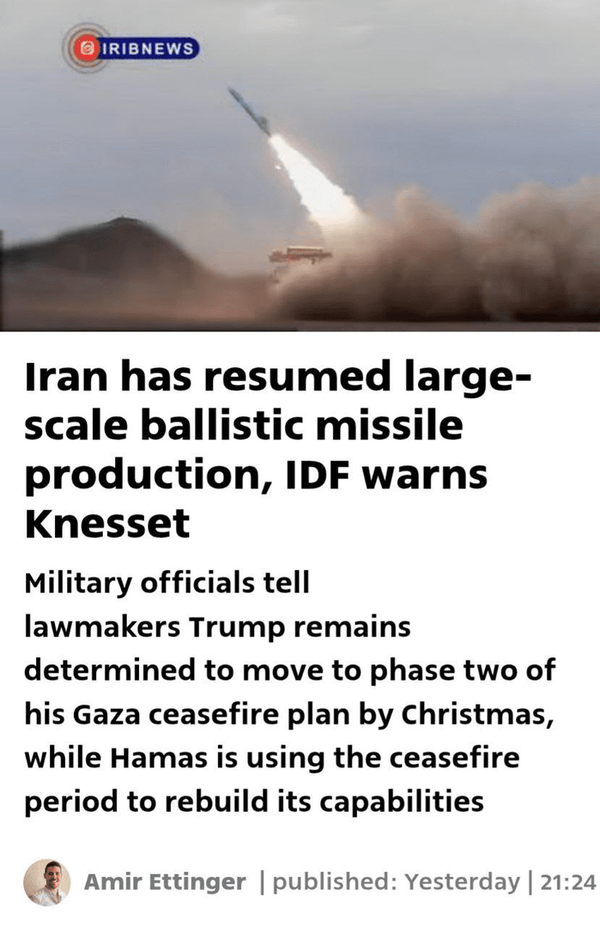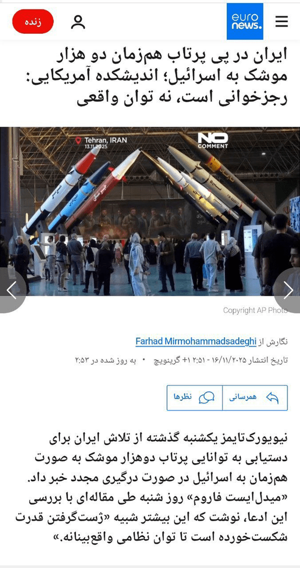 این اندیشکده آمریکایی خبر مذکور را رجزخوانی و نه توان واقعی ایران نامید اما خبری اخیرا از سوی رسانه صهیونیستی وای نت منتشر شده که نشان میدهد که در جلسه محرمانه در کنست بر قابلیت پرتاب انبوه موشکی ایران تاکید شده است.این رسانه اسرائیلی خبر داد یک نماینده ارشد ارتش اسرائیل در جلسه غیرعلنی کمیته امور خارجی و دفاع کنست به نمایندگان گفت که ایران تقریباً شش ماه پس از درگیری ۱۲ روزه با اسرائیل، تولید انبوه موشکهای بالستیک را از سر گرفته است.وای نت ادامه داد: «این هشدار در اورشلیم در حالی منتشر شد که ایران فعالیتهای نظامی جدیدی را به نمایش گذاشت. روز جمعه، تهران از رزمایش دریایی بزرگی توسط سپاه پاسداران انقلاب اسلامی در خلیج فارس خبر داد که شامل موشکهای بالستیک، موشکهای کروز و پهپادها بود.» وای نت به توان موشکی ایران که توسط دیپلماتها و رسانههای غربی تایید شده اشاره کرد و نوشت: «دیپلماتهای غربی همچنین در هفتههای اخیر نگرانیهایی را مطرح کردهاند مبنی بر اینکه ایران در تلاش است تا روند بازیابی موشکهای خود را تسریع کند. به گفته این مقامات، ایران قصد دارد در هرگونه درگیری آینده، صدها موشک، احتمالاً ۵۰۰ تا ۱۰۰۰ موشک، را به طور همزمان شلیک کند.»