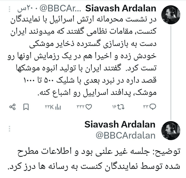 در همین راستا، «سیاوش اردلان» خبرنگار بیبیسی فارسی طی پستی در شبکه ایکس نوشت: «در نشست محرمانه ارتش اسرائیل با نمایندگان کنست، مقامات نظامی گفتند که میدونند ایران دست به بازسازی گسترده ذخایر موشکی خودش زده و اخیرا هم در یک رزمایش اونها رو تست کرد. گفتند ایران با تولید انبوه موشکها قصد داره در نبرد بعدی با شلیک ۵۰۰ تا ۱۰۰۰ موشک، پدافند اسراییل رو اشباع کنه.»خبرنگار بیبیسی در توضیح توییت خود تاکید کرد:«جلسه غیر علنی بود و اطلاعات مطرح شده توسط نمایندگان کنست به رسانه ها درز کرد.»