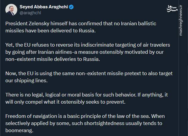 رئیس جمهور زلنسکی شخصا تایید کرده که هیچ موشک بالستیک ایرانی به روسیه صادر نشده است ،با این حال، اتحادیه اروپا حاضر نمی شود به هدف قرار دادن ناعادلانهی مسافران هوایی از طریق تحریم خطوط هواپیمایی ایران پایان دهد- اقدامی که ظاهرا به ادعای واهی تحویل موشکهای ما به روسیه اتخاذ شده بود.