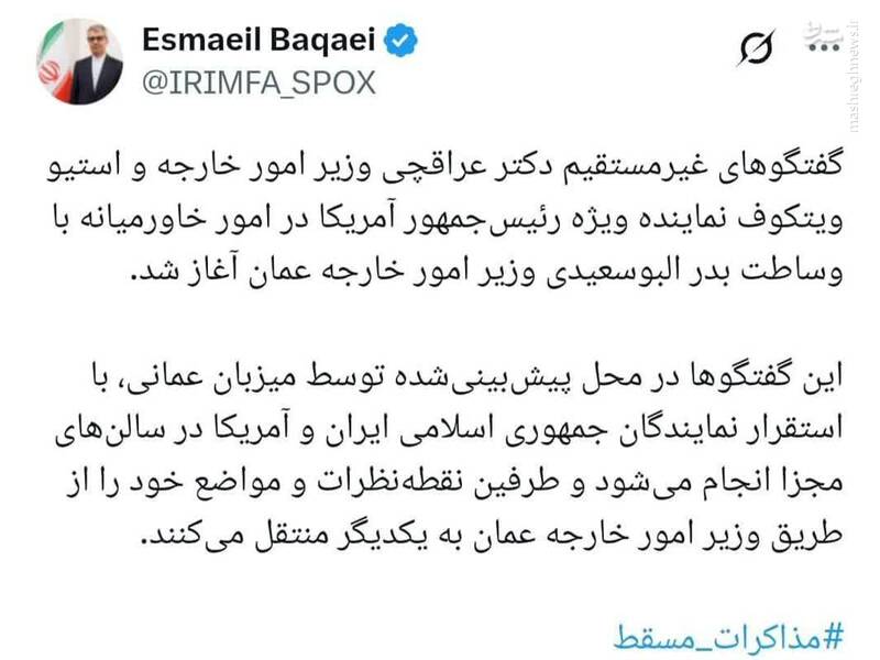 اسماعیل بقائی اظهار داشت: گفتگوهای غیر مستقیم میان ایران و امریکا از طرف عراقچی و ویتکوف حدود ساعت ۳: ۲۰ دقیقه به وقت عمان با وساطت وزیر خارجه عمان اغاز شده است.