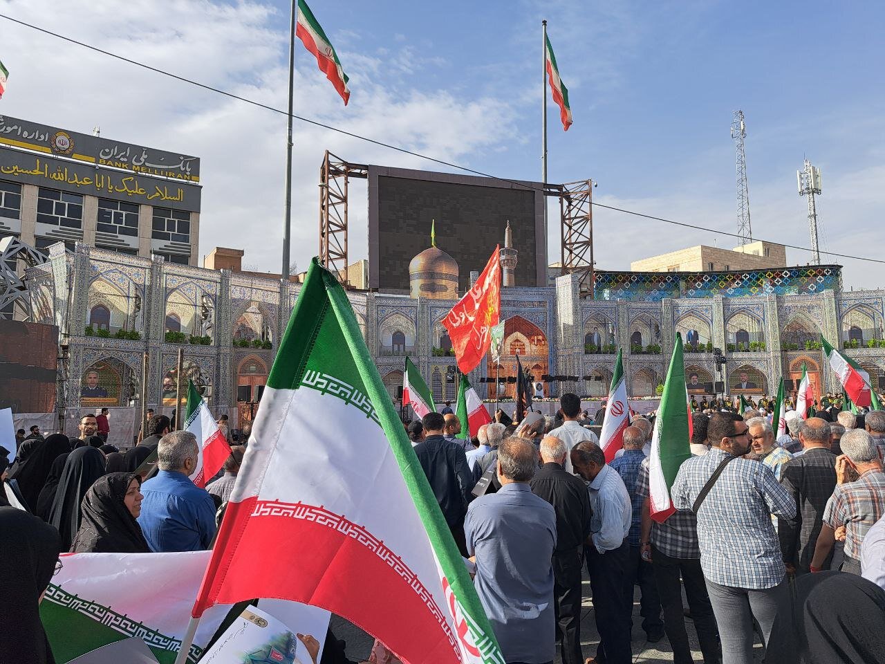 همچنین مردم با در دست داشتن پرچمهای جمهوری اسلامی ایران و عکسهایی از رهبر معظم انقلاب، شهید رئیسی و شهدای خدمت، شعارهای «مرگ بر آمریکا» و «مرگ بر اسرائیل» سر دادند.