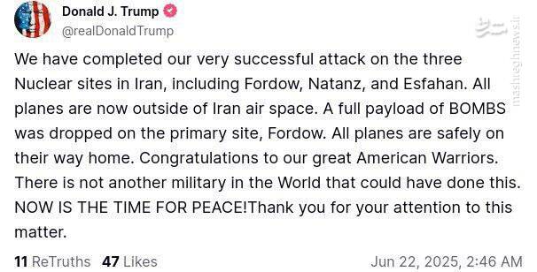 ترامپ بامداد یکشنبه نوشت: ما همین حالا حمله بسیار موفقیت آمیز خود را به سه سایت هسته‌ای ایران از جمله فردو، نطنز و اصفهان تکمیل کرده‌ایم. او در ادامه نوشته است: همه هواپیماها هم‌اکنون خارج از حریم هوایی ایران هستند.