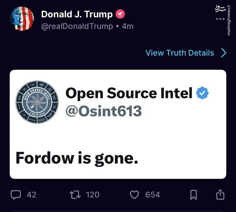 او همچنین در پیام دیگری مدعی شد: «فردو نابود شده است.»